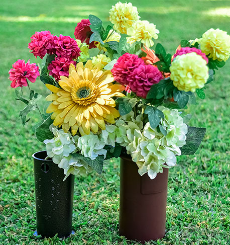 Los floreros que nosotros ofrecemos son especiales para ser usados dentro del cementerio. Estos están fabricados de bronce con un recubrimiento impermeable que le permite una larga duración junto con un brillo bastante vistoso, al mismo tiempo se entrega con una base plástica donde viene incorporado un filtro de agua para que este no retenga líquido y evitar la oxidación apresurada.